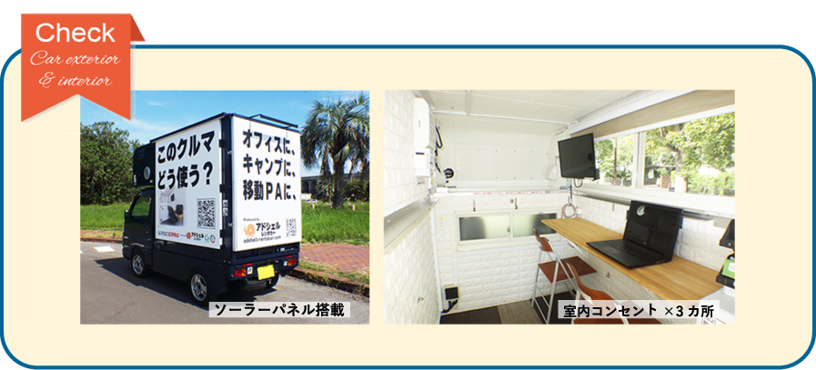 アドオフィスは天井高が175センチの広い空間を実現。外部電源の引込でパソコンやプリンターの使用、スマホ・タブレットの充電ができ、家庭用ウインドクーラー、小型セラミックファンヒーター、24インチモニター、車載用冷蔵庫も標準装備なので、快適なオフィス空間としてご利用いただけます。また、オプションの大容量1,500Wポータブル電源があれば外部電源が接続出来ない場所でもオフィス機能が使えます。ソーラーパネルも搭載しているので、充電しながら電源が使え、オフィスワークや商談・接客・休憩所等に大活躍です。 アドカーとして アドオフィスは4面に広告パネルを設置出来るので、アドカーの様に移動しながらPR活動が出来ます。